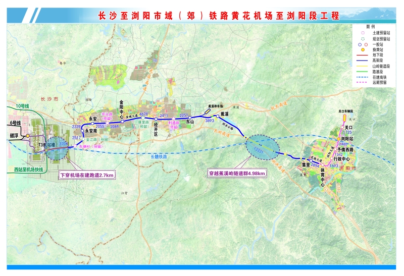 長瀏快線采用一次性規(guī)劃、分段實(shí)施。線路全長48.73km,起于黃花機(jī)場T3航站樓,止于瀏陽關(guān)口站。首期建設(shè)黃花機(jī)場至集里段,該段自長沙磁浮東延線終點(diǎn)T3航站樓引出,沿新河南路、金城大道、瀏永公路敷設(shè),期間需下穿黃花機(jī)場在建跑道、上跨杭長及武深高速。首期建設(shè)線路長39.52km,總投資約104.4億元,新建車站7座,均為高架站,土建預(yù)留高架站3座,規(guī)劃預(yù)留高架站2座,平均站間距3.95km,新建蕉溪車輛基地。
